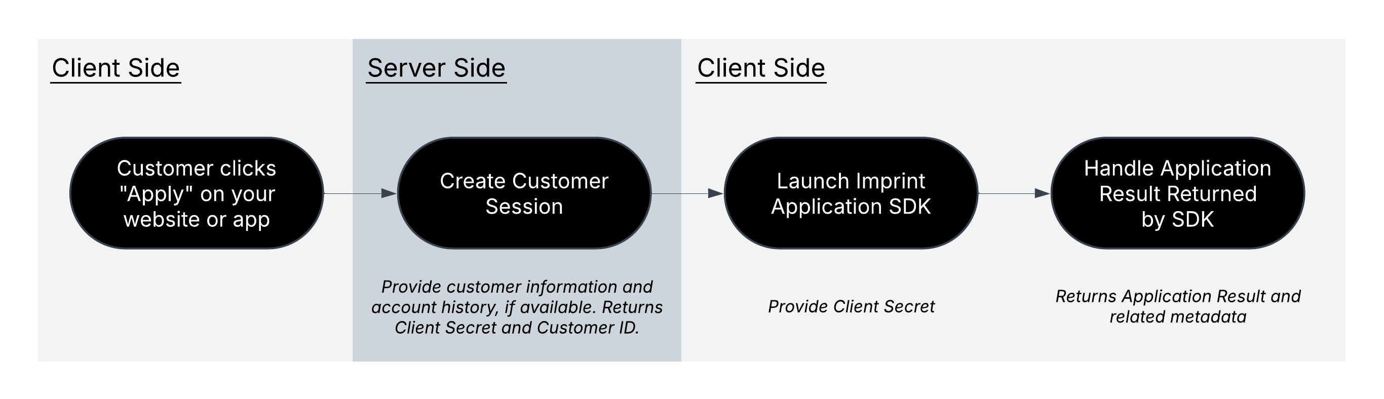 Once the customer clicks “Apply” on your site or app, you will start by creating a new customer session with Imprint. In this request, you can share transaction and account history data (if available) to provide Imprint with more context regarding the customer and augment their application data. This request starts a customer-specific, time-limited session and responds with a Client Secret, which you will need to display the Imprint application experience in the next step. The Client Secret is a piece of secret data, do not log it.Step 2: Render the Imprint application experience