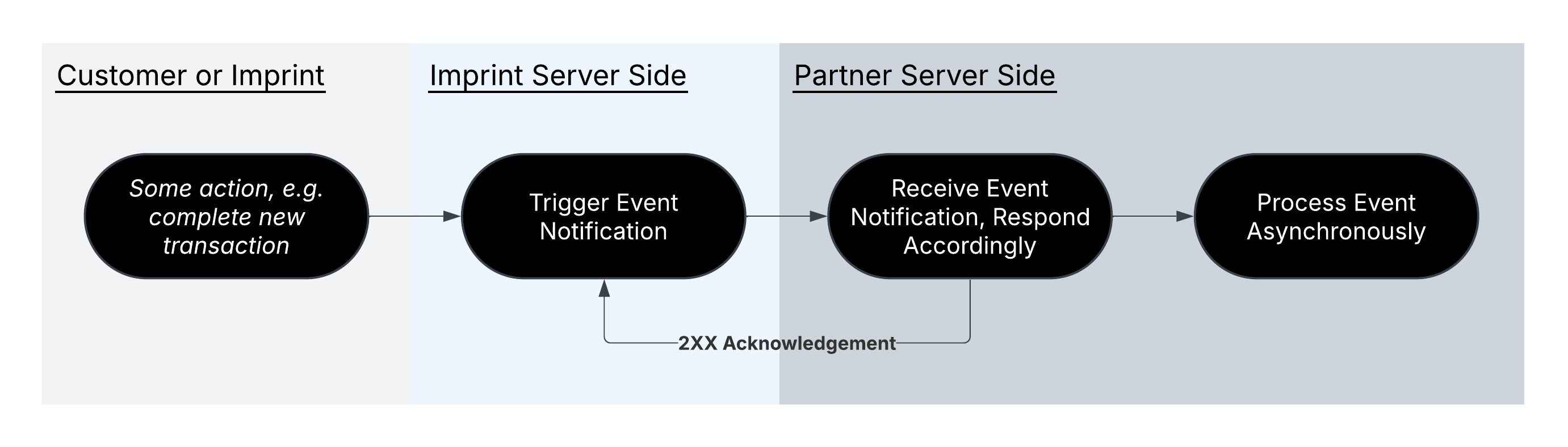 Your system should acknowledge events with a 2XX HTTP response status to confirm successful receipt. If a delivery fails, Imprint will retry the request based on an exponential back-off strategy.